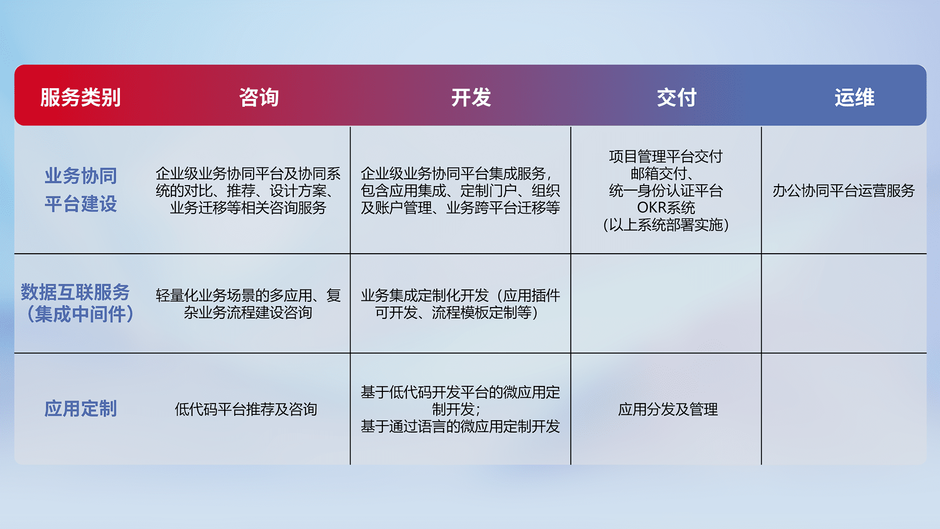 针对钉钉、、企微、、IDaas等平台级产品提供产品的规划、、、方案、、、交付、、、、定制化开发等服务,,实现如统一协同办公、、智能客户服务、、混合会议管理、、、智能数据查询、、、等业务场景,,实现数字化转型。。